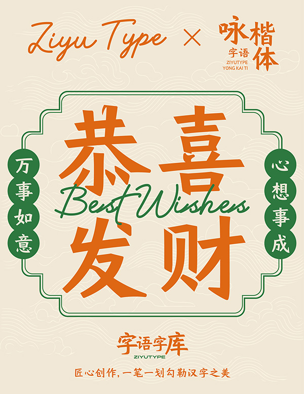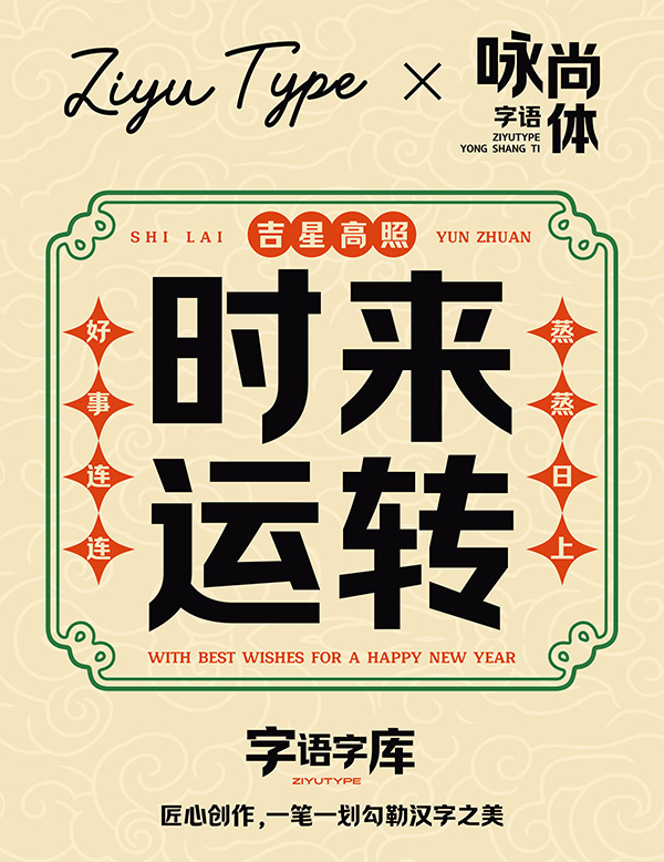 字語詠尚體其結構上加入了黑體的韻味,整體粗細均勻,“點、撇、捺、勾”的收筆為垂直切;文字輪廓兼具幾何形態,簡潔理性。適用於活動宣傳、文藝雜誌、綜藝影視、廣告以及品牌包裝等場景。