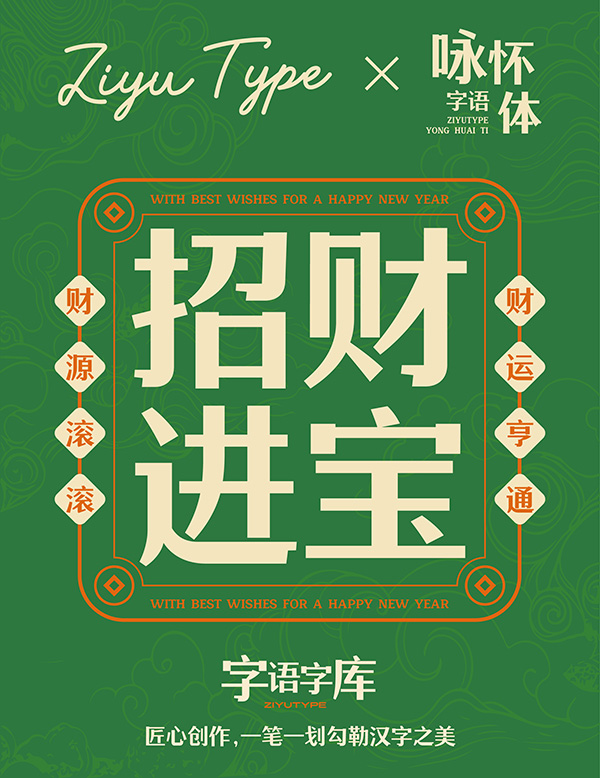 字語詠懷體字面較大,結構嚴謹,厚重醒目,布白均勻,重心平穩;筆形設計簡潔有力,撇捺舒展有張力,勾劃捺劃收筆處靈巧,閱讀舒適流暢;適用於標題、屏幕、招牌、包裝、廣告、遊戲等場景。
